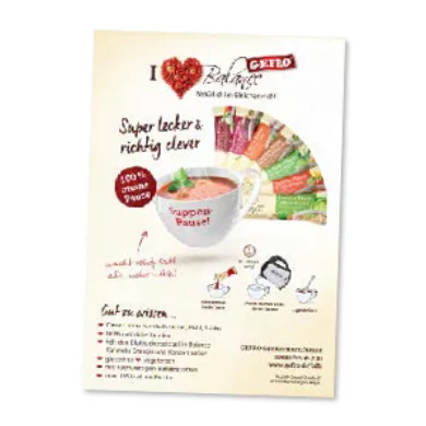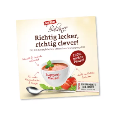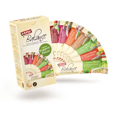 Die GEFRO Balance Suppen-Pausen sind natürlich, aromatisch, lecker, ballaststoffreich und machen Ihre Gäste unterwegs schnell und einfach satt.