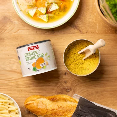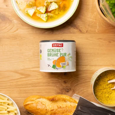 In Rezepten ersetzt Du herkömmliche Gemüsebrühen einfach durch GEFRO Gemüsebrühe PUR. Probiers mal aus bei der Nudelsuppe mit Kalbfleischklößchen oder beim Suppentopf mit Hackfleisch.