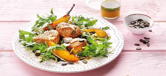 Schweinemedaillon und gebratene Birne auf Rucolasalat