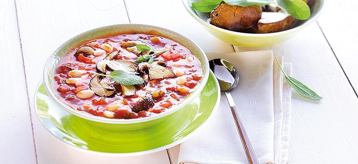 1 Liter warmes Wasser aufgießen und 100 g GEFRO Balance Tomatensoße & -Suppe Dolce Vita einrühren und aufkochen. Die gewürfelten Tomaten, 1 EL Rotweinessig und eine Prise Zucker dazu geben und etwa 5 Minuten köcheln lassen. Die gekochten Bohnen auf einem Sieb abtropfen lassen und zur Tomatensuppe geben. Mit Salz und Pfeffer würzen.