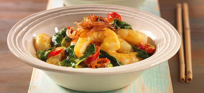 600 g küchenfertige Garnelen in heißem GEFRO Omega-3-Speiseöl kurz anbraten und mit etwas Salz würzen. 300 g jungen, geputzten Blattspinat und die Garnelen in die Kokossoße geben und den Spinat zusammenfallen lassen.