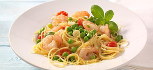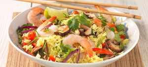 Asiatischer Reissalat mit Zuckerschoten und Garnelen