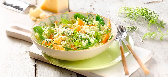 In der Zwischenzeit die gehackten Kräuter, das gehackte Ei, die gewürfelte Salatgurke und die Schalotte mit 1 EL Weißweinessig, 100 ml klarer Brühe aus GEFRO Suppe, 1 TL Senf und 2 EL GEFRO Omega-3-Speiseöl zu einer Kräutervinaigrette verrühren. Mit GEFRO Salatwürze abschmecken.