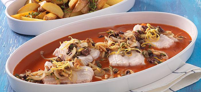 Gehackte Oliven, Zitronenzesten, die Pinienkerne, Petersilie sowie 50 g Kapern in die Soße geben und die Soße über den Fischfilets verteilen. Die Form für 10 Minuten in den Ofen geben.