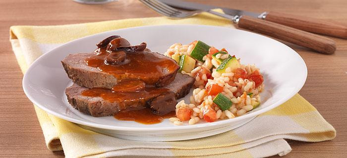Die Kalbsschulter in dünne Scheiben schneiden, mit der aromatischen Zitronen-Oliven-Soße übergießen und zusammen mit dem Gemüsereis servieren.