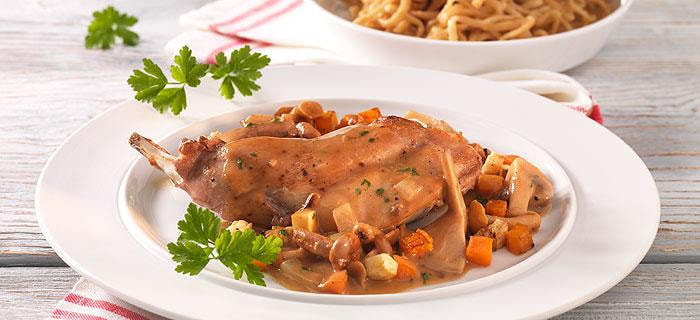 Geschmorte Kaninchenkeule in Waldpilzsoße