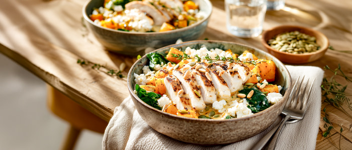 Hähnchenbrust auf warmem Kürbissalat mit Spinat und Feta