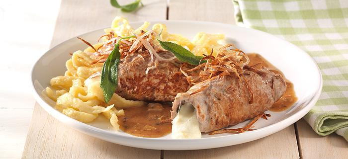 Filetröllchen mit Jägersoße: Den Backofen auf 180 °C vorheizen. 650 g Schweinefilet in 8 gleichdicke Scheiben schneiden. 80 g Mozzarella in 8 Scheiben schneiden. Die Filetscheiben flach klopfen und mit GEFRO Fleischwürze würzen. Jeweils mit einem Salbeiblatt, einer halben Scheibe Parmaschinken, einer Scheibe Mozzarella und einer getrockneten Tomate belegen. Das Fleisch zusammenrollen und die Enden mit einem Zahnstocher fixieren.