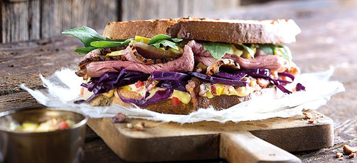 8 dicke Scheiben Bauernbrot auf den Grill legen und von beiden Seiten etwas anrösten. Die Brotscheiben mit der Mayonnaise bestreichen. Auf vier Scheiben den Rotkohl verteilen. Das Fleisch in dünne Scheiben schneiden und mit dem Rucola auf dem Rotkohl verteilen.