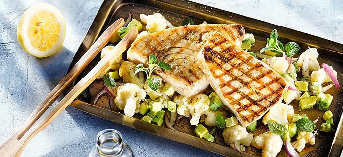 Gegrillter Schwertfisch mit Blumenkohlsalat in Avocado-Zwiebelvinaigrette