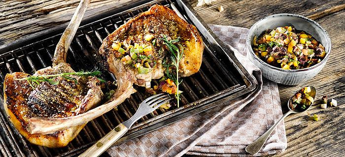 Gegrilltes Schweinekotelett mit mediterraner Olivensalsa