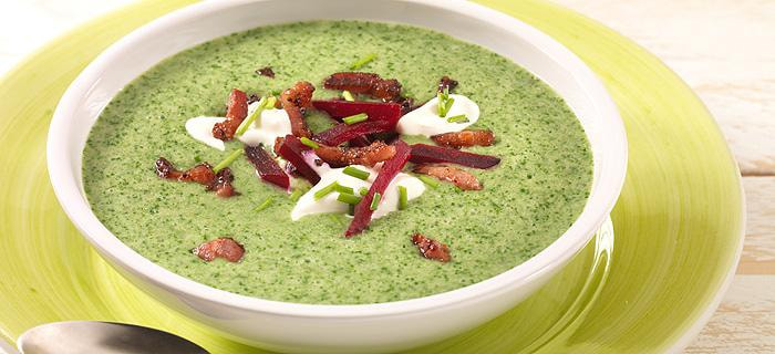 Kräuter-Lauch-Cremesuppe mit Speck und roter Beete