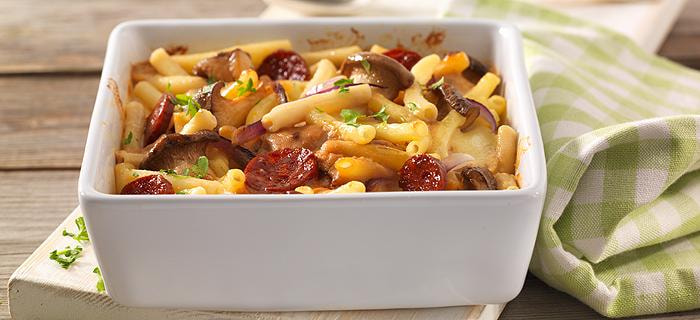 Maccaroni-Auflauf mit Steinpilzen, Chorizo und Mozzarella