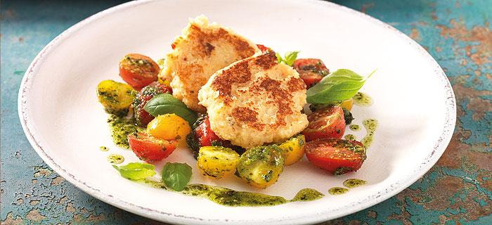 Gebratener Ricotta auf Pesto-Tomatensalat