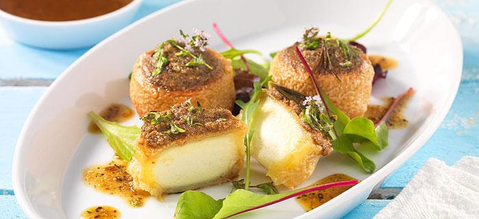 4 Stück gereiften Ziegenkäse (à 70 g) in eine ofenfeste Form setzen und die Pesto-Gratinmasse darauf verteilen. Für etwa 6 Min. im vorgeheizten Ofen gratinieren. In der Zwischenzeit aus 1 EL Weißweinessig, 2 EL Wasser, 2 EL GEFRO Bio Olivenöl Nativ Extra sowie etwas GEFRO Salatwürze eine Vinaigrette rühren.