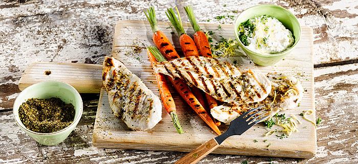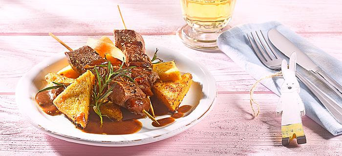 Lamm-Dattel-Spieße auf gebratener Haselnuss-Polenta