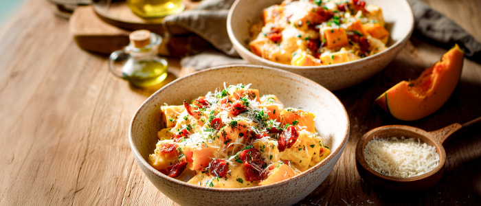 Die Kürbis-Chorizo-Carbonara auf Tellern oder in Schalen anrichten und sofort servieren.