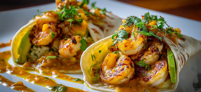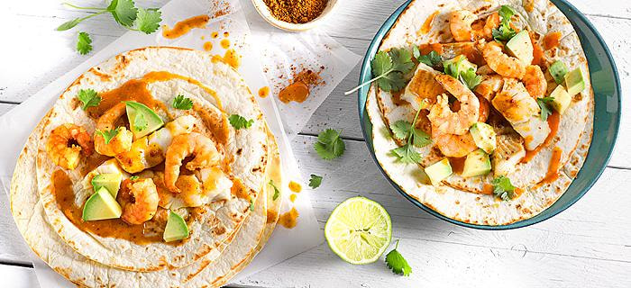 Fischwraps mit Garnelen und Koriander-Tomatensoße