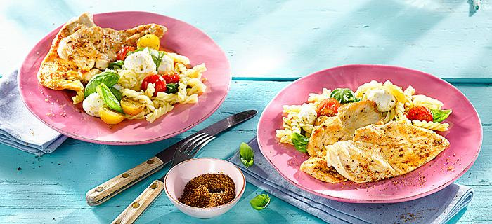 Hähnchen-Minutenschnitzel mit Mozzarella-Nudelsalat