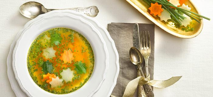 Die Brühe mit den bunten Sternen in tiefen Tellern anrichten und mit frisch geschnittenem Schnittlauch bestreuen.