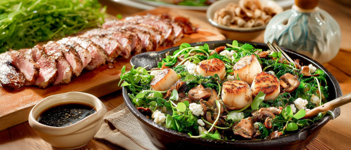 Feldsalat mit gebratenen Jakobsmuscheln und Speck