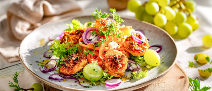 Salat, Möhren, Trauben und Zwiebelringe mit der Vinaigrette marinieren und auf Tellern anrichten.