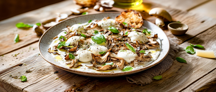 4 Kugeln Mozzarella à 100 g in Scheiben schneiden, in die Mitte des Pilzcarpaccios setzen und mit etwas GEFRO Kräuterwürze würzen. Mit 12 Basilikumblättern garnieren und das Carpaccio sowie den Mozzarella mit GEFRO Bio Olivenöl Nativ Extra beträufeln.