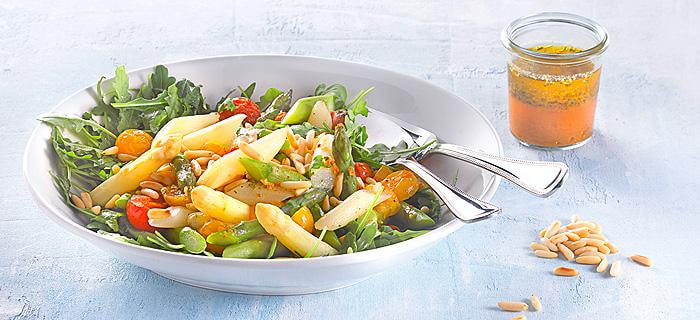 Spargel-Rucola-Salat mit Ofentomaten und Pinienkernen