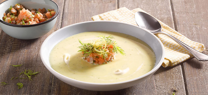 Kartoffel-Meerrettichsuppe mit Zitrone und Lachstatar