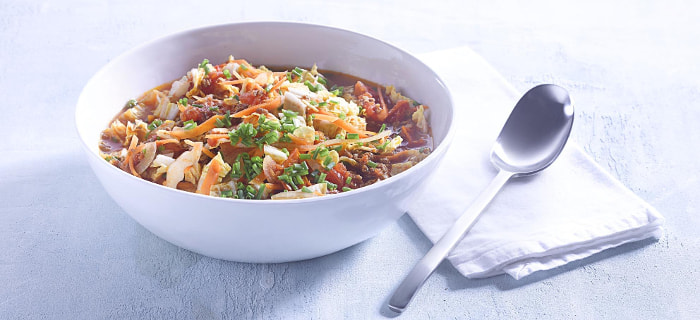 Tomatiger Eintopf von Chinakohl und Hackfleisch