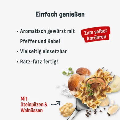 Einrühren, umrühren, fertig - wenn dich der schnelle Hunger packt, ist das Pesto Funghi in Rekordzeit servierbereit. Gönn Dir den Geschmack von Steinpilzen, wann immer Du willst!